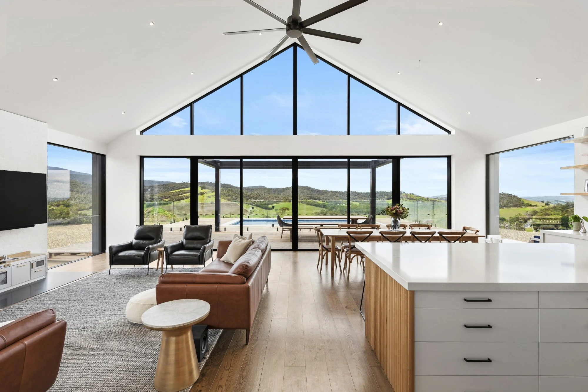 Enormous sliding doors & raked windows overlooking the alfresco area & swimming pool